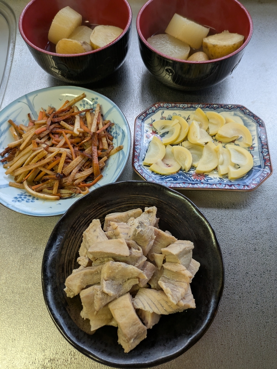朝採れのタケノコ湯がいたもの、オカカとお醤油で頂きます〜大根とじゃがいも🥔のおでん🍢大根の皮と人参🥕のきんぴら〜マグロのアラ煮〜あとは、昨日のほうれん草の胡麻和えですよ~